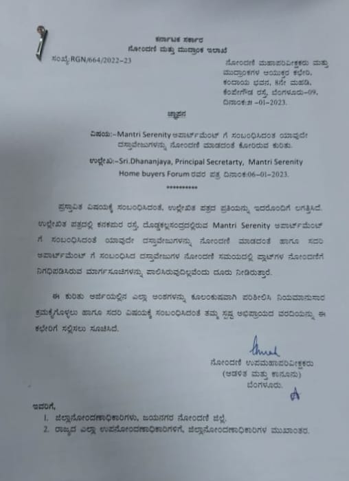| Mantri Serenity Apartment Registrations | N | As per request from Dhananjaya, Principal Secretary Mantri Serenity Home Buyers Forum, DIGR issued notification RGN/664/2022-23 (dated 21/01/2023) to all district sub-registrars to look into the registration guidelines of Mantri Serenity Apartments and to take appropriate actions and also asked to submit opinion back to the department. | ![]() |